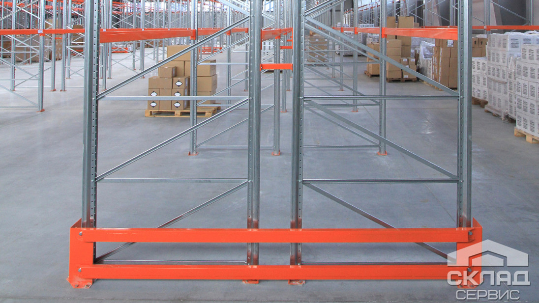 Две стойки соединены между собой диагональными связями при помощи болтов, образуя раму стеллажа. Рамы крепятся к полу анкерными болтами за подошву стоек.