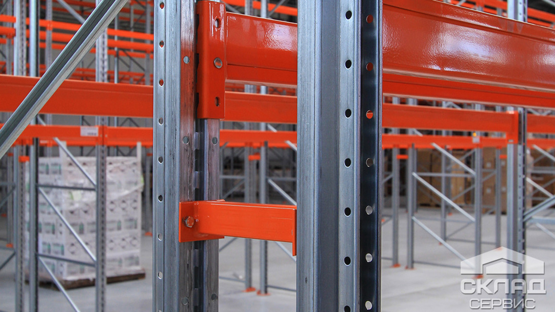 На фото хорошо видны межрядные соединения, которые жестко скрепляют 2 ряда стеллажей в одну монолитную конструкцию.