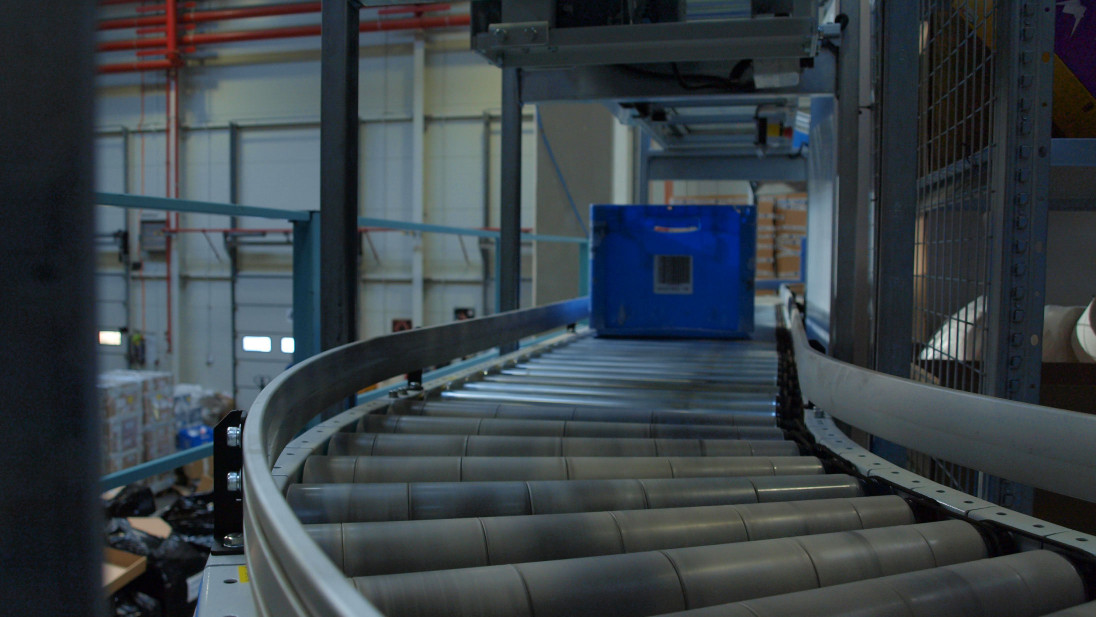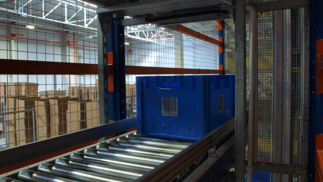 The main types of box and crate conveyors are roller conveyors and belt-type conveyors. The latter also make it possible to transport piece products, since the entire conveyor belt is also a solid shelf for products. Belt-type conveyors are also practically irreplaceable for product movement between storeys of a warehouse or mezzanine.