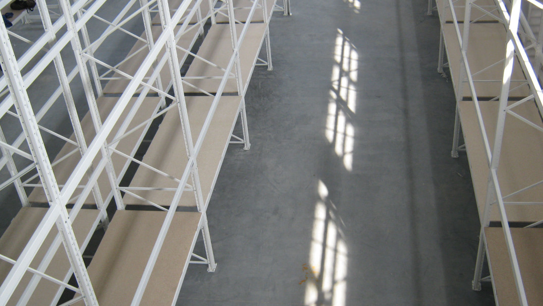 Depending on the required load, you can use a 30 or 38 mm thick chipboard, OSB or MDF. If you need maximum durability and stability when goods are handled carelessly, when heavy objects are almost thrown onto the rack, you can use a 25-50 mm thick hardboard. The latter option is also interesting because it allows you to repair local parts of the shelf and not whole sheets.