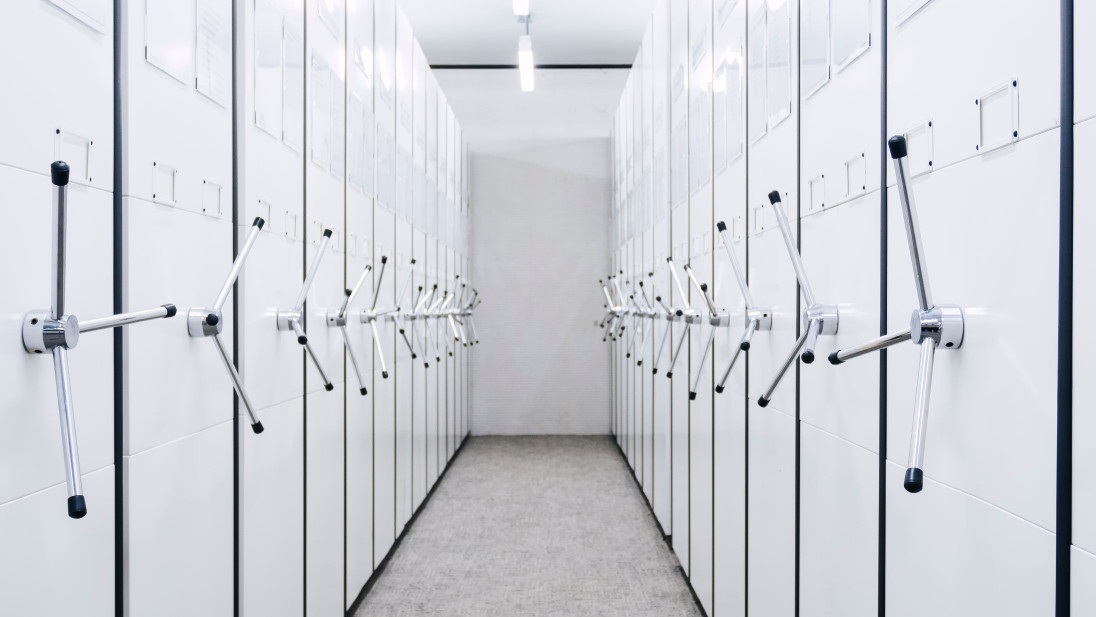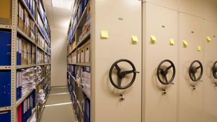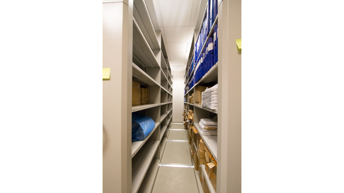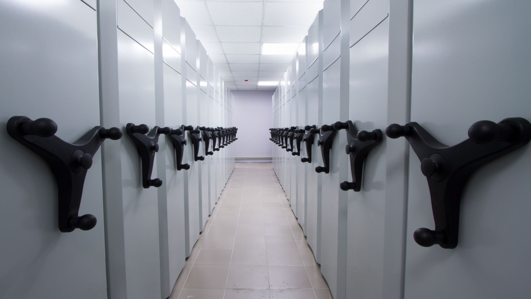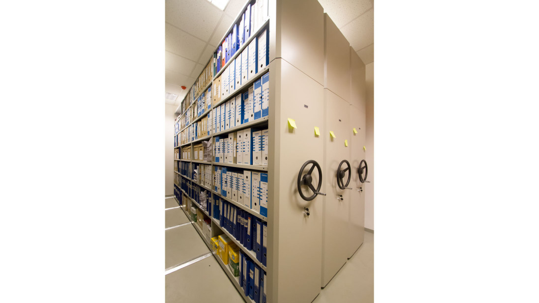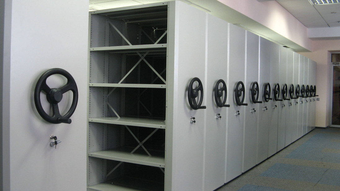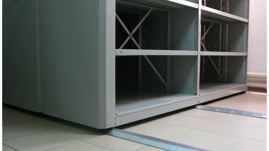 Принципиально архивные мобильные стеллажи очень похожи на стационарные полочные конструкции, установленные на мобильные базы, которые перемещаются по рельсам. Подобные системы рационально применять, когда интенсивность работы относительно невысокая, ведь в каждый момент времени доступен только 1 рабочий коридор, а для того, чтобы подойти к очередному стеллажу, потребуются некоторые усилия и время.