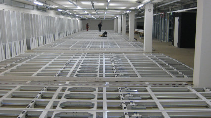 Минимальная высота профиля направляющих рельсов делает возможным их применение в уже отремонтированных помещениях, не требуя строительной подготовки (как в случае складских стеллажей). В большинстве случаев заказчики просто устанавливают рельсы на пол и переступают их. Но возможна также установка т.н. фальшпола, который обеспечивает ровное покрытие, снижает вероятность травм и повреждения оборудования.