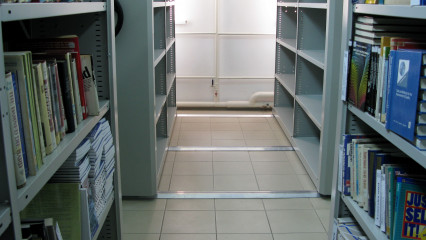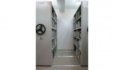 Мобильные стеллажи используются там, где относительно невысокая интенсивность использования стеллажей, так как одновременно можно использовать только один коридор между стелажей.