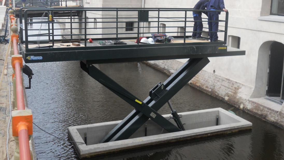 Электрогидравлический узел состоит из гидравлического подъемника и электрического механизма управления. При подаче питания происходит движение поршня домкрата, опорная точка которого подвижно закреплена на оси ножничного механизма. Это приводит к подъему верхних концов ножничных балок, на которых располагается грузовая платформа. Таким образом расположенные на ней паллеты и другие грузы поднимаются на нужную высоту. Спуск происходит за счет собственной массы платформы.