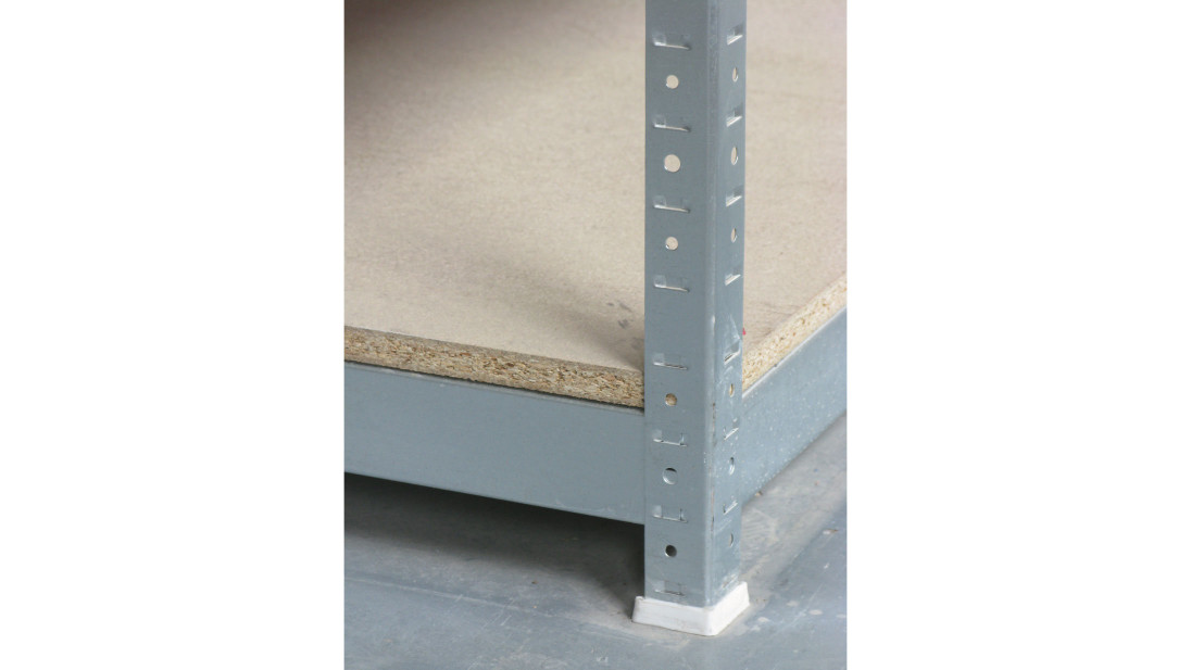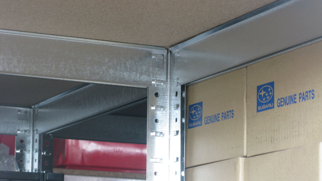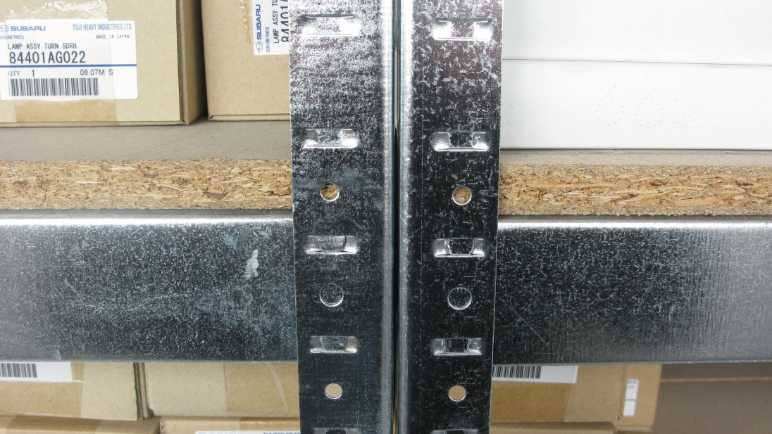 Несущим элементом стеллажа являются Г-образные стойки (уголки) размером 30х30 мм, перфорированные по всей высоте с шагом 38 мм. Полка состоит из настила и 4-х опорных перемычек, которые надежно соединяют между собой все стойки одной секции стеллажа на 2 зацепа в каждой точке крепления. Как и у большинства современных стеллажей, есть возможность переставлять полки по высоте в процессе эксплуатации, уменьшать или добавлять ярусы хранения, если не превышаются допустимые нагрузки.