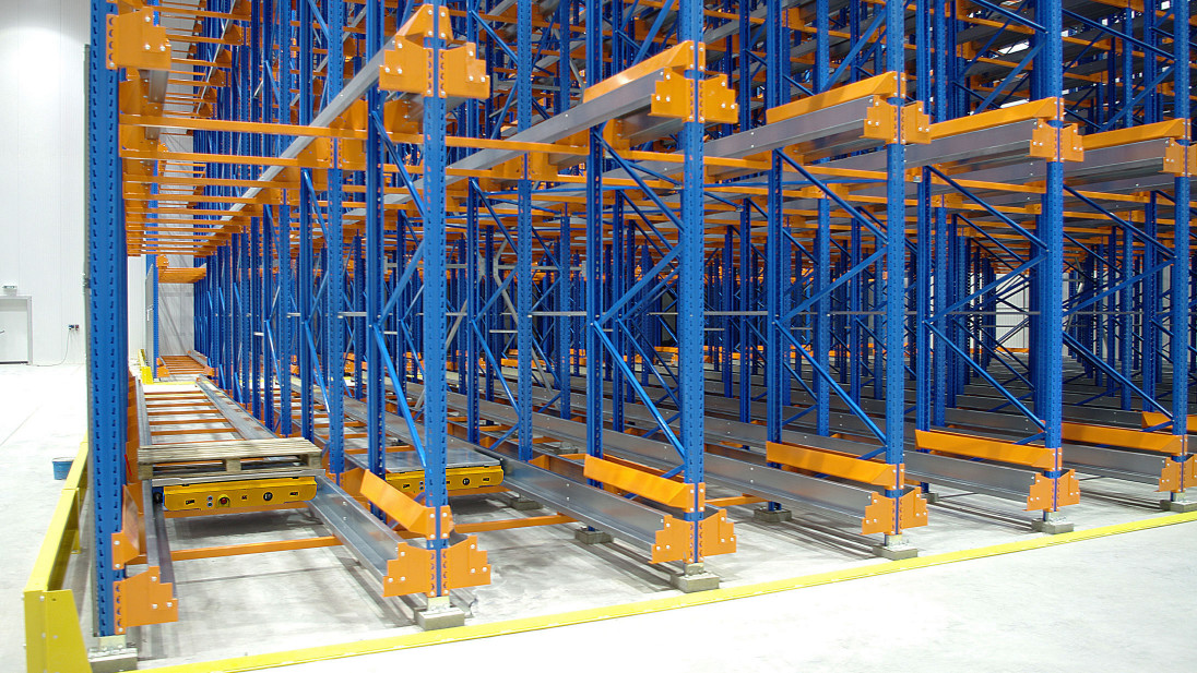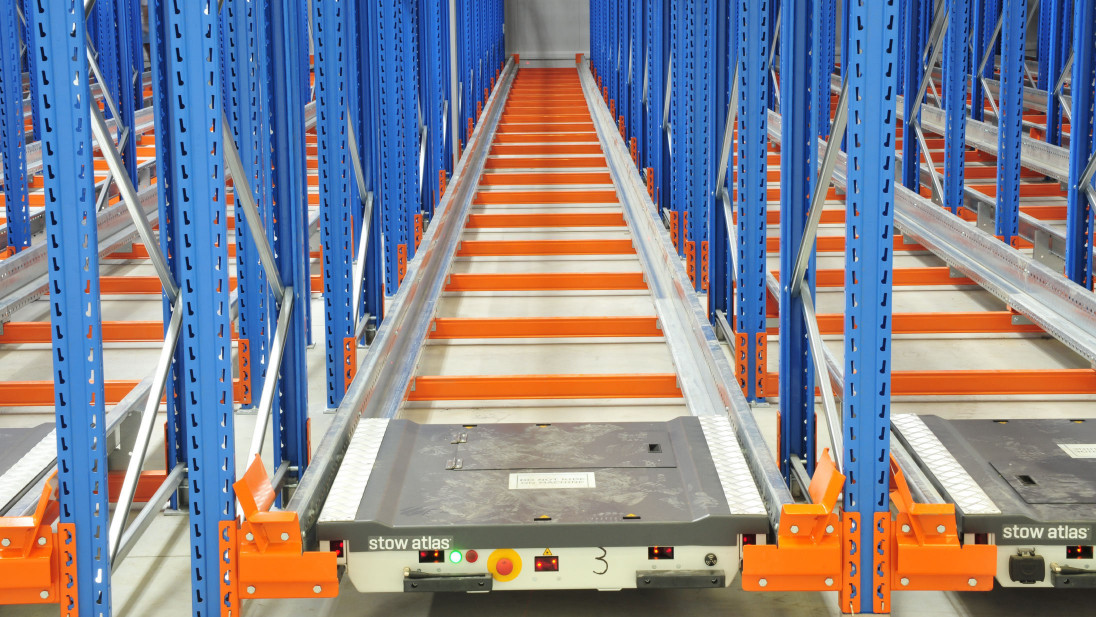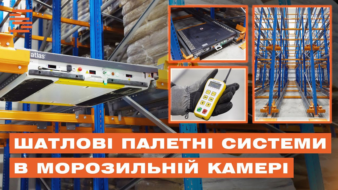 Это стеллажная система с автоматизированной платформой (шаттл), которая самостоятельно перемещает паллеты по направляющим вглубь стеллажа. Шаттл оснащен датчиками и управляется при помощи пульта ДУ. Как и гравитационные стеллажи, данные системы рассчитаны на хранение 1 SKU в канале.