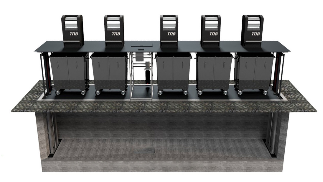 Внутри подъемной платформы могут размещаться обычные пластиковые или оцинкованные баки на 1100 л, которые опрокидываются за цапфы или гребенку. Размер платформы и количество баков может быть изготовлено под заказ. Нужно руководствоваться потенциальной интенсивностью использования и доступной площадью для организации приямков.