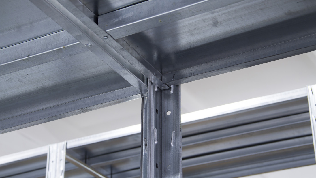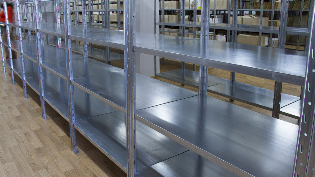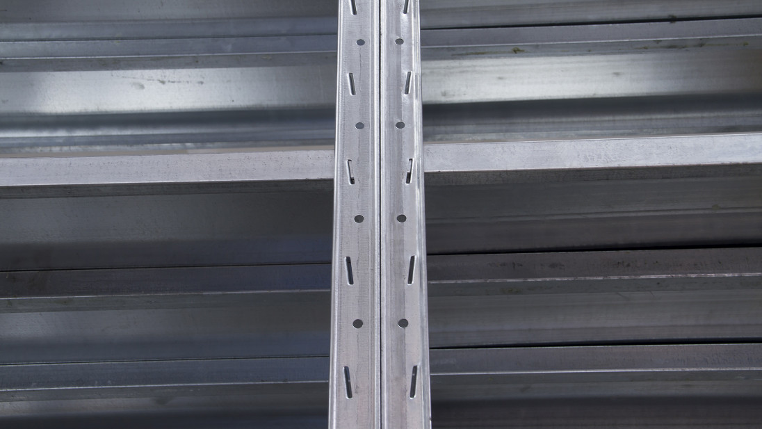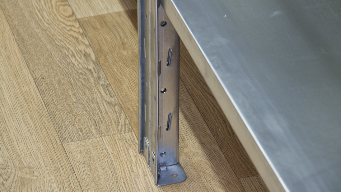 Стойки стеллажей Смарт выполнены из металла толщиной 1,2 мм и имеют специальные зацепы-пазы, в которые плотно насаживаются полки без применения болтов и дополнительных инструментов.