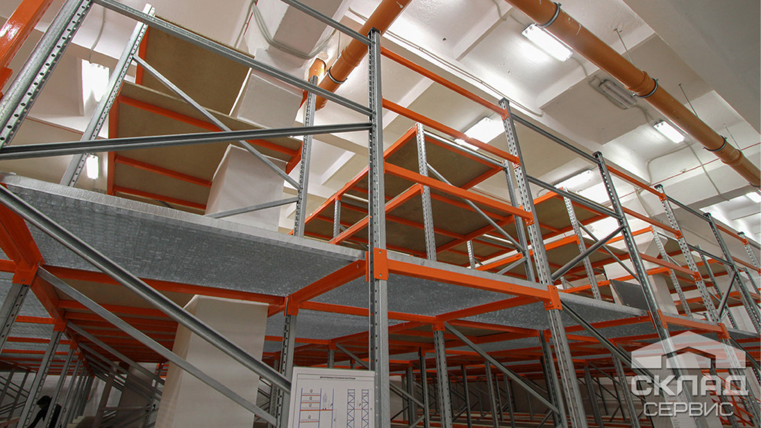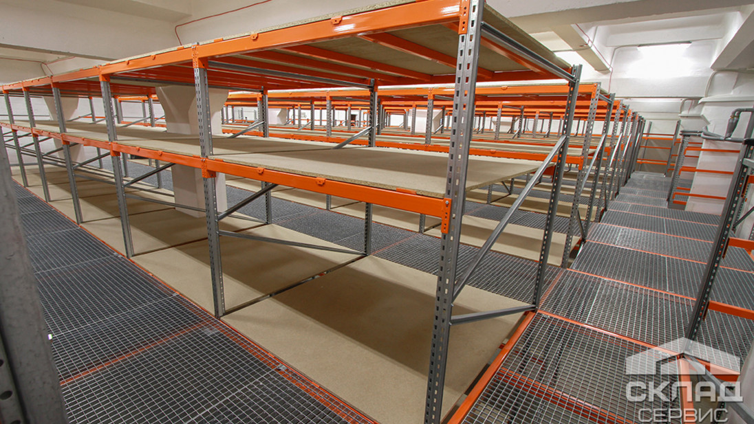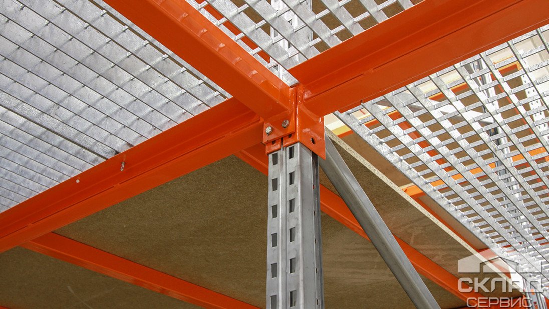 На фото хорошо видны элементы стеллажей: к оцинкованной стойке из профиля шириной 50 мм крепятся несущие балки (траверсы), покрашенные оранжевой эмалью, в проходах на балках закреплены решетки перекрытий. Полки для товаров изготовлены из листов шлифованного ДСП, которые для прочности уложены на металлические перемычки.