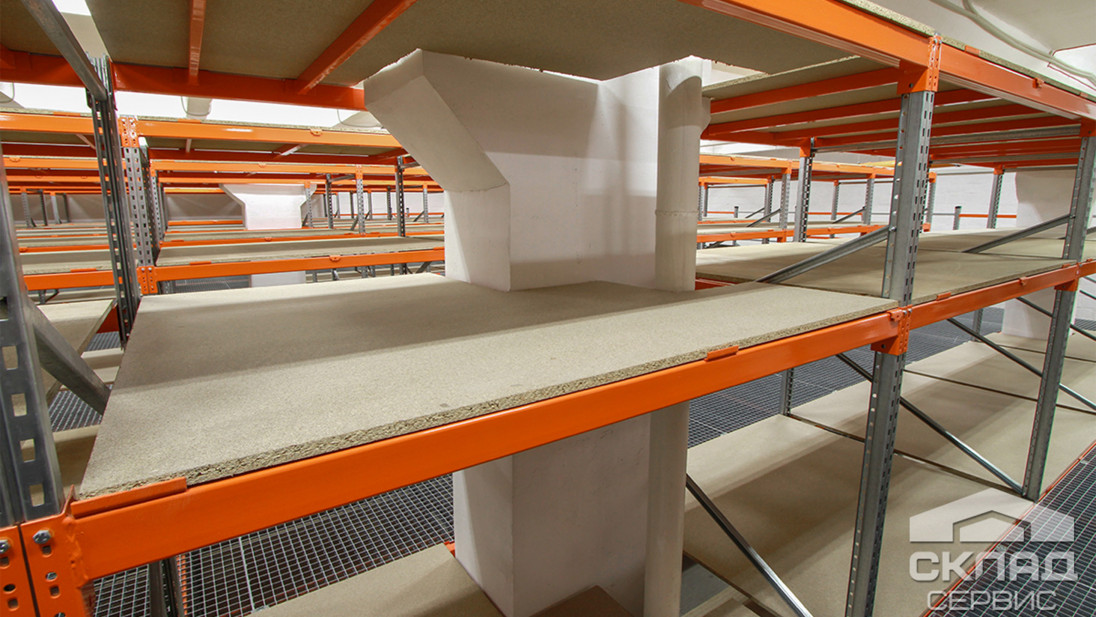 Для интеграции в конструкцию мезонина несущих колон здания и труб, в полках были вырезаны соответствующие отверстия. Можно смело сказать, что в этом складе эффективно используется каждый квадратный сантиметр :)