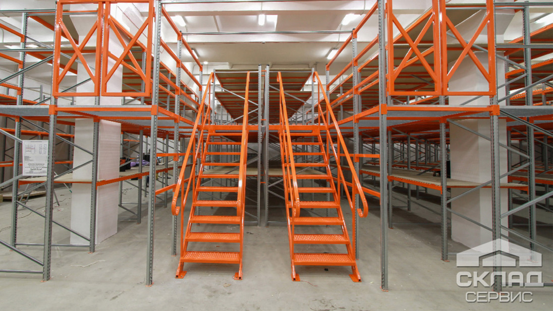 На мезонине установлены 2 лестницы, одна из них двойная, которая позволяет разминуться людям при интенсивной работе. Для этих же целей по обеим сторонам лестницы предусмотрены погрузочные ворота для погрузки/разгрузки товара на второй этаж.