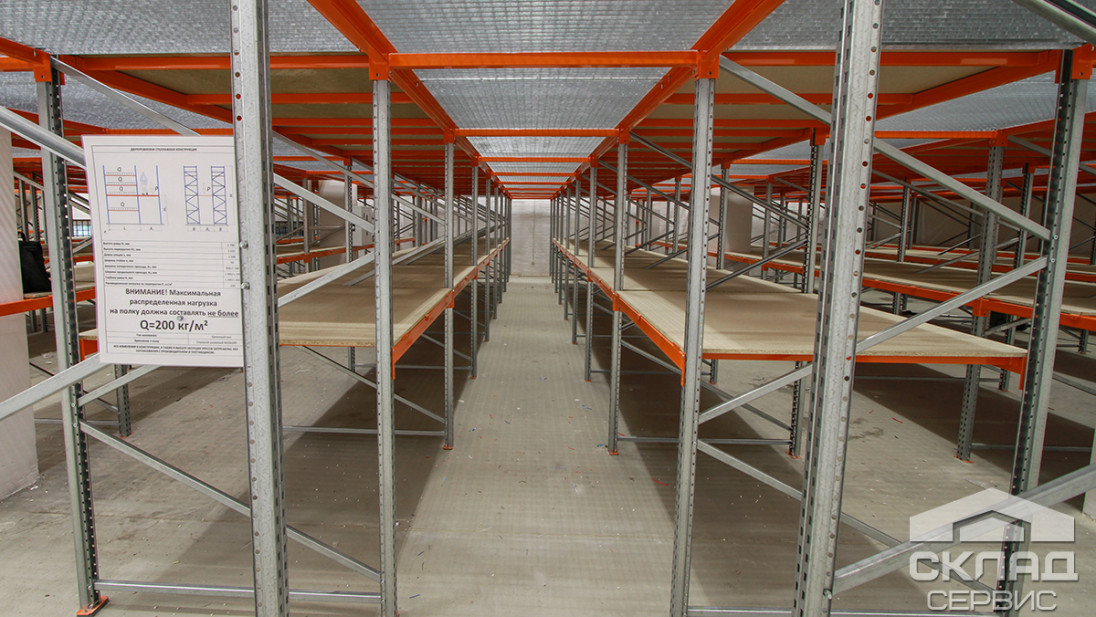 На втором этаже установлены полки из ДСП в 3 яруса, включая напольный. Ширина рабочих коридоров на мезонине – 1 000 мм.