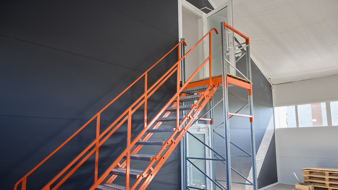 - Вбудовану мезонінну платформу, яка розділяє приміщення на три зони: склад, сервісну зону та офісне приміщення