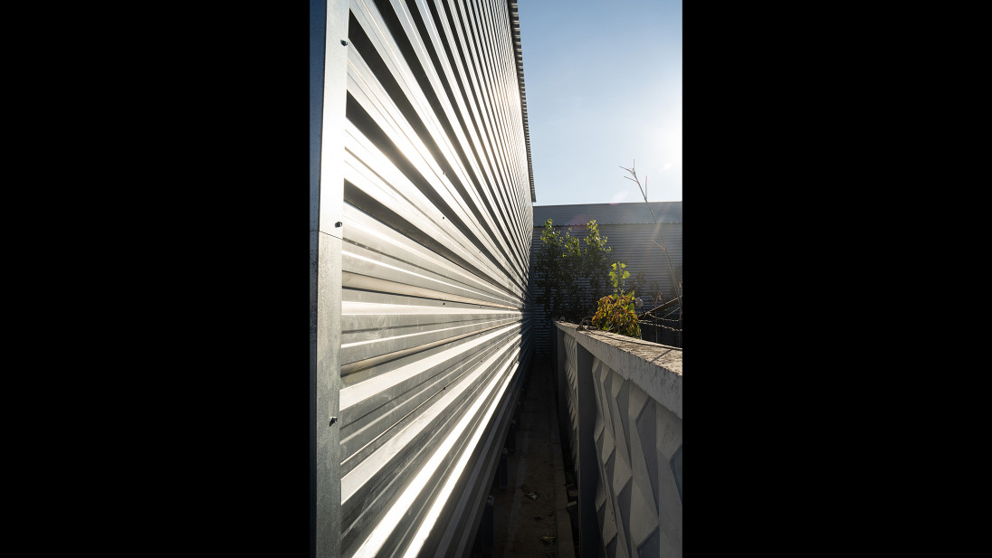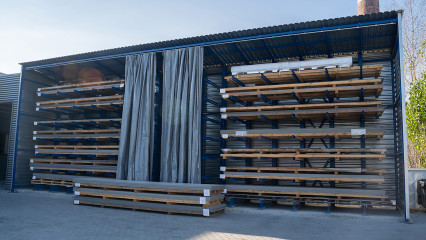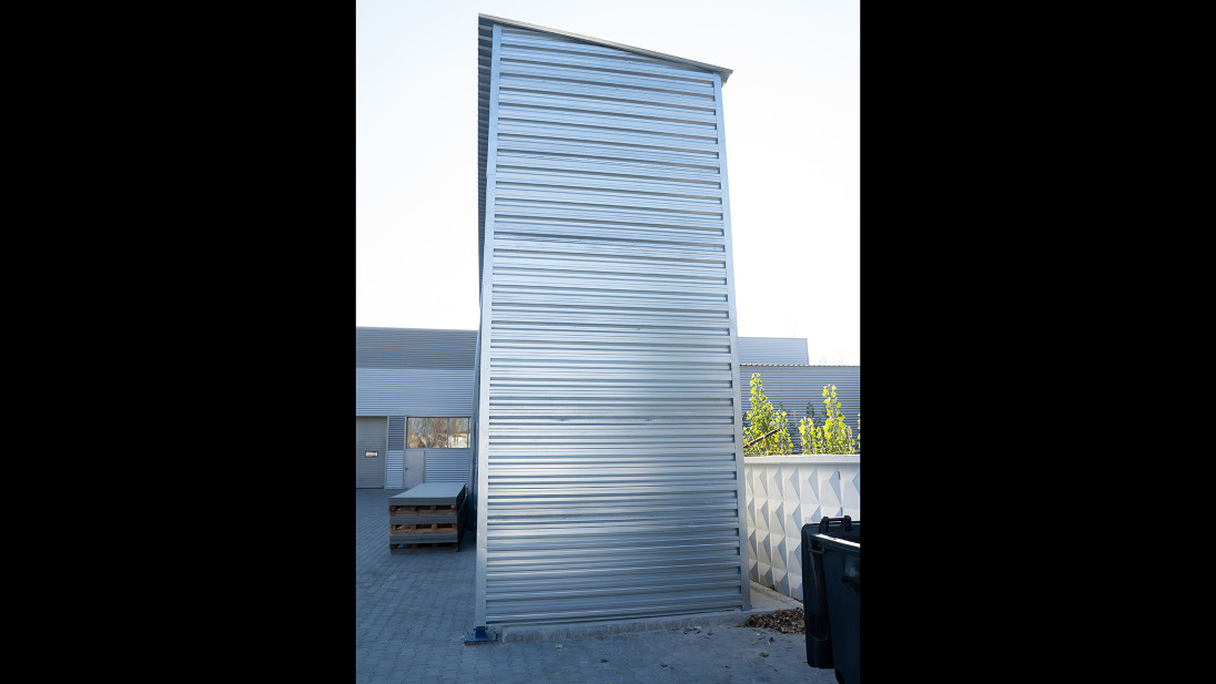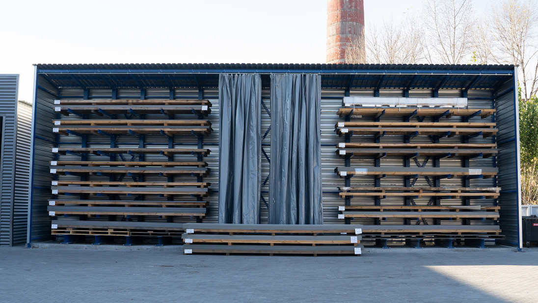 Для защиты продукции от внешних воздействий, боковые части системы были обшиты металлопрофилем. С фронтальной стороны - предусмотрели раздвижную шторку для удобства выгрузки/загрузки товара.