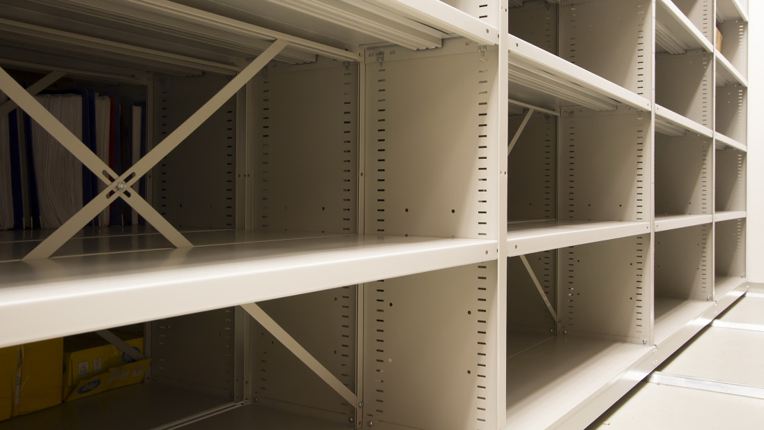 У стен были установлены полочные стеллажи для небольших нагрузок, которые отлично справятся с хранением бумаг и стоят недорого. Рабочего коридора шириной 900 мм вполне достаточно для доступа персонала к полкам стеллажей.