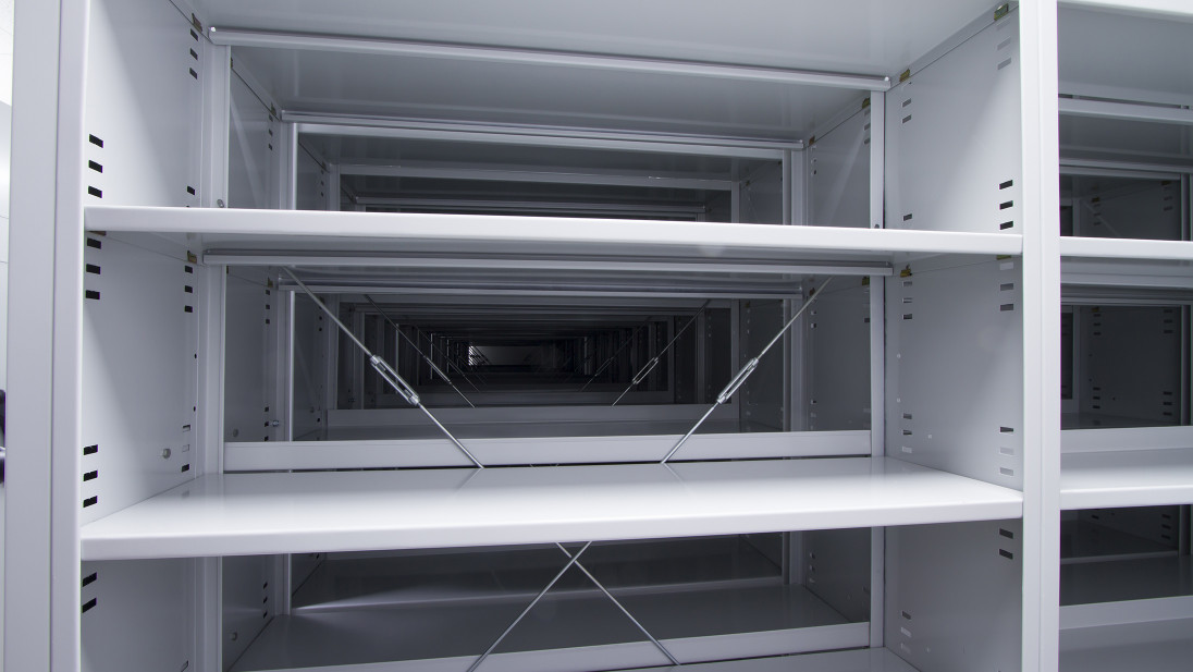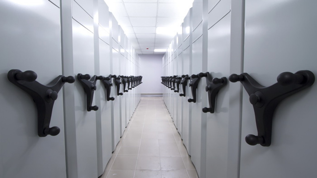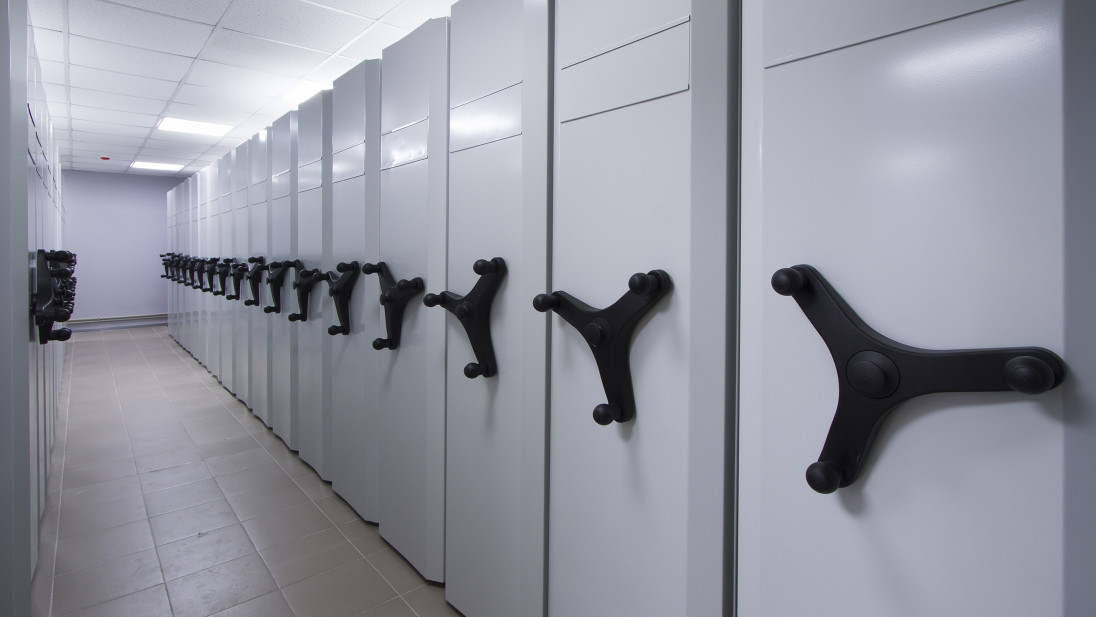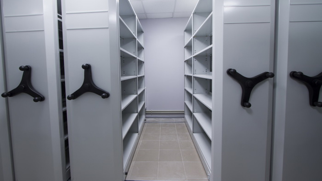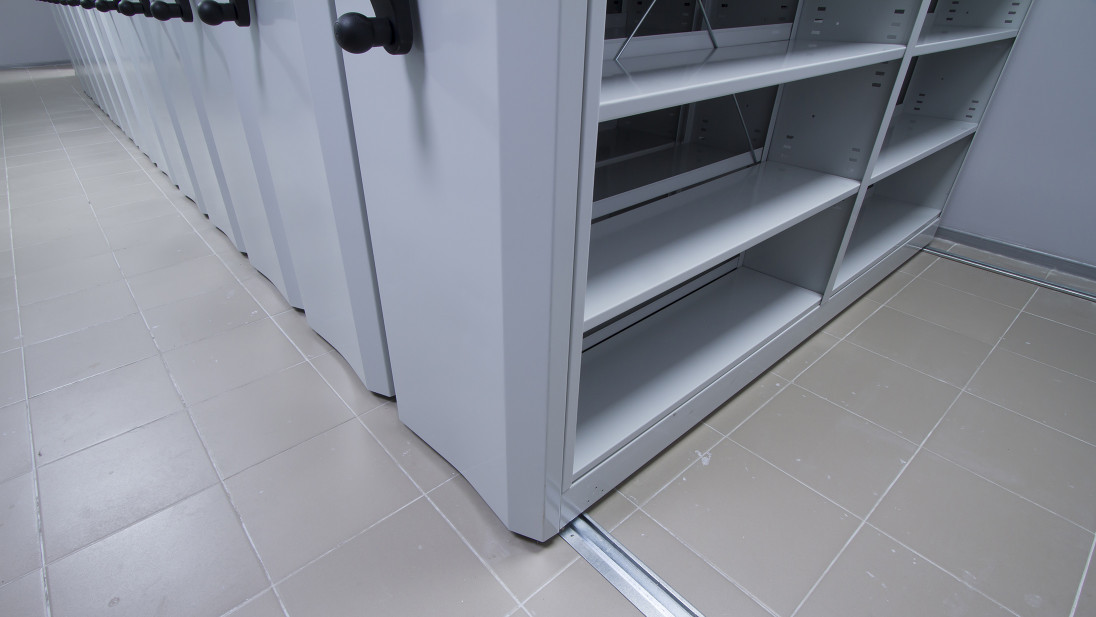 Стеллажи установлены на металлические рельсы, а удобные штурвалы позволяют сотрудникам архива легко приводить в движение до трех секций одновременно. Опционально можно изготовить мобильные стеллажи с замками, блокирующими доступ к архиву.