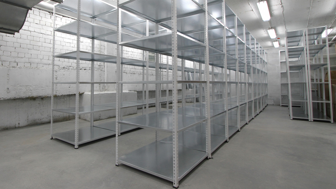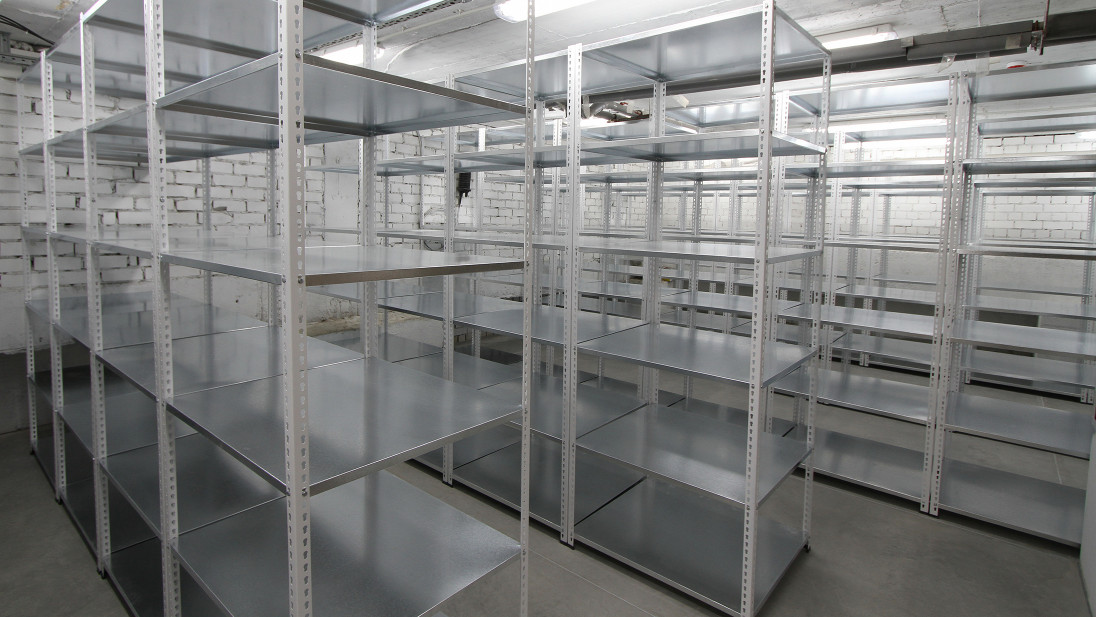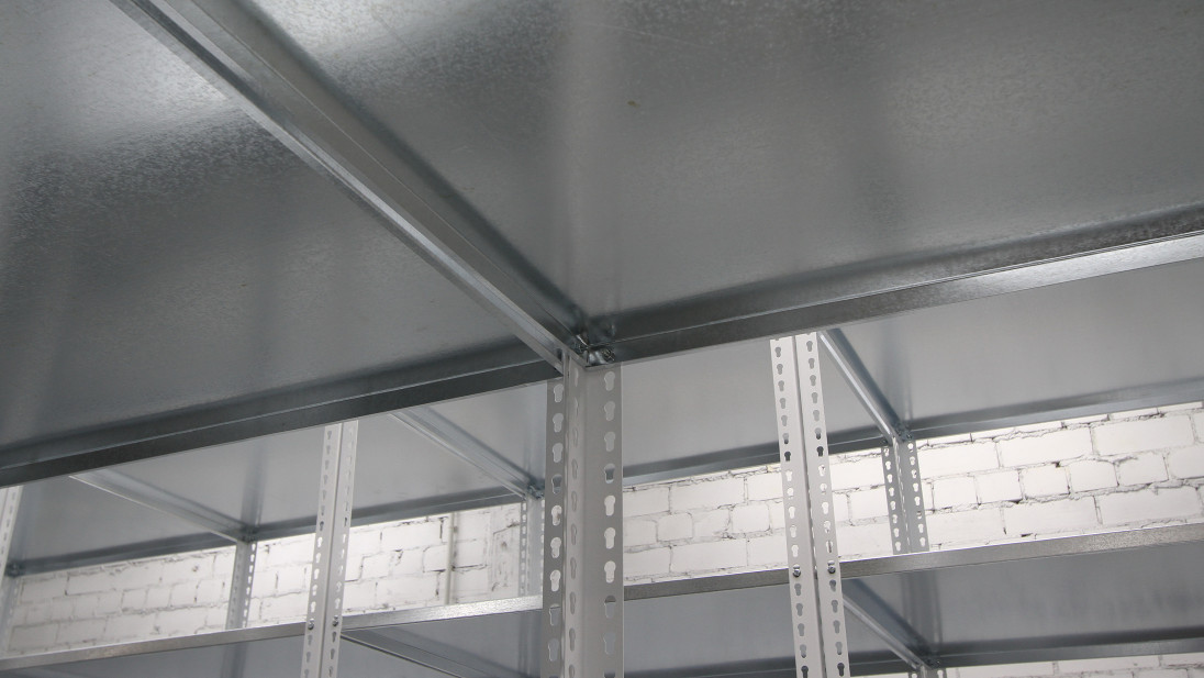 Полки выполнены из оцинкованной стали и рассчитаны на нагрузки до 50 кг. Нижние полки установлены у самого пола. Стеллажи не крепятся к полу, а каждая стойка «обута» в специальный пластиковый «подпятник».
