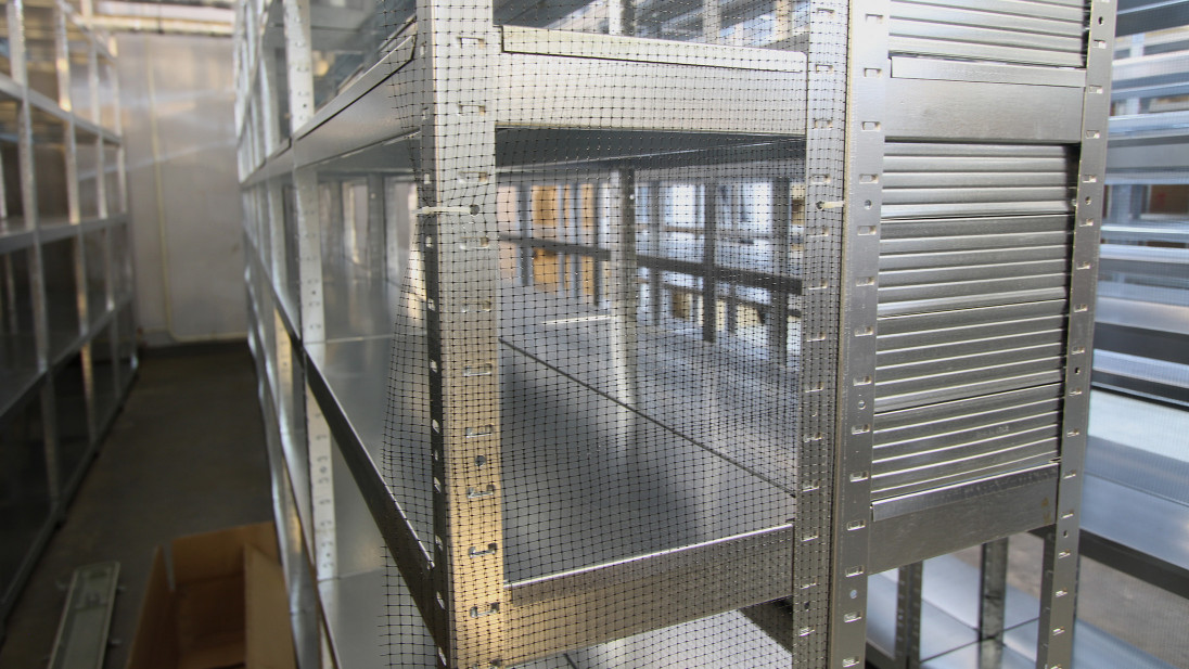 В некоторых стеллажах для разделения товара были использованы перегородки из металлической сетки. Это очень не дорогой материал, который к тому же хорошо пропускает свет на полки, что немаловажно при слабом освещении склада.