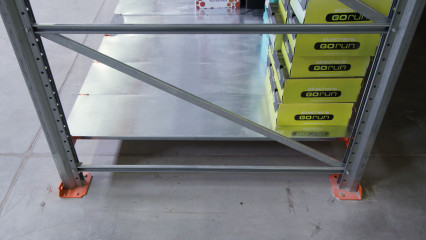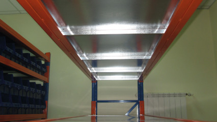 Полиці мають рельєфну будову з ребрами жорсткості. Така конструкція дозволяє металевим панелям не прогинатися під вагою важкого вантажу і зберігати цілісність протягом усього періоду експлуатації. Крім того, це дозволяє збільшити граничне навантаження на полицю.