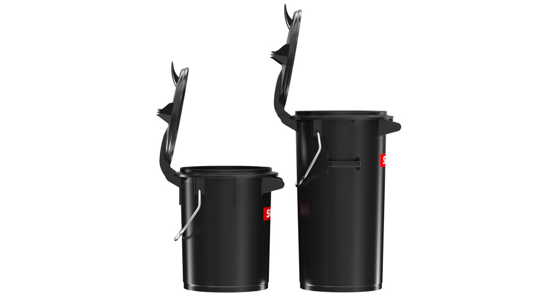Бак оснащений щільною кришкою з ручкою та фіксуючою скобою, що запобігає поширенню запахів і несанкціонованому доступу. Ергономічні ручки на корпусі полегшують транспортування. Гладка внутрішня поверхня з заокругленими кутами забезпечує легке чищення та гігієнічність. Корозійностійкі металеві компоненти, такі як елементи кріплення кришки, гарантують тривалий термін служби.
