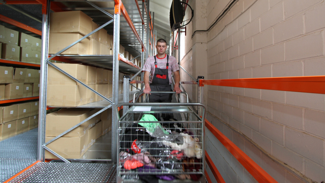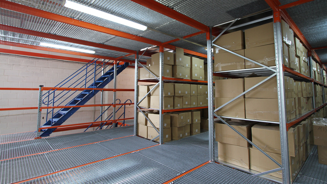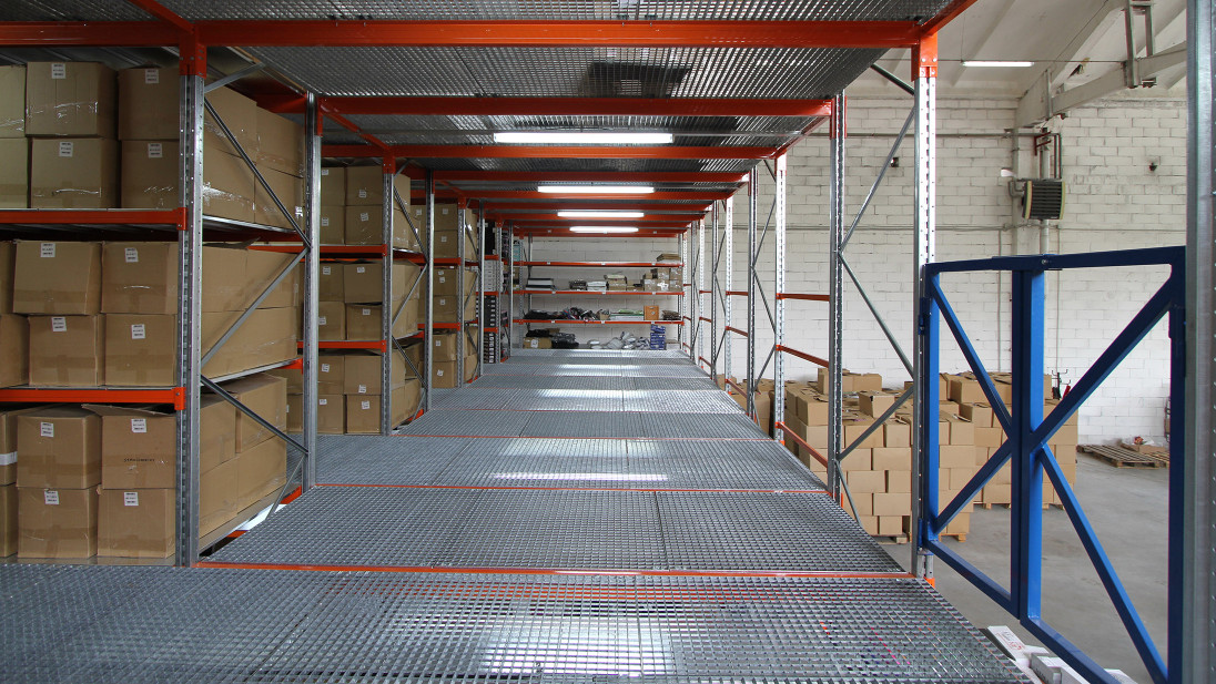 Цей мезонін, заснований на конструктиві палетних стелажів, був розроблений і введений в експлуатацію для інтернет магазину одягу, косметики і продуктів харчування для гурманів. IT-торгівля передбачає роздрібні продажі, при цьому асортимент товарів нараховує тисячі або навіть десятки тисяч артикулів. Тому для такої специфіки краще підходить зберігання товару на полицях, а щоб це було ще ефективнішою, потрібно використовувати всю висоту приміщення, для чого і був побудований 3-х поверховий мезонін.