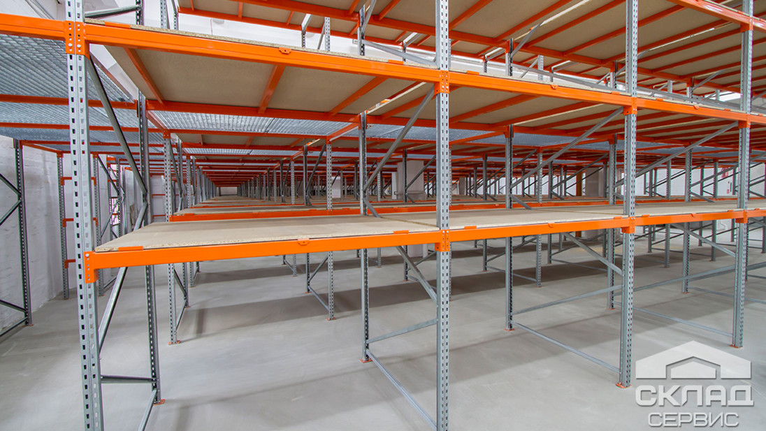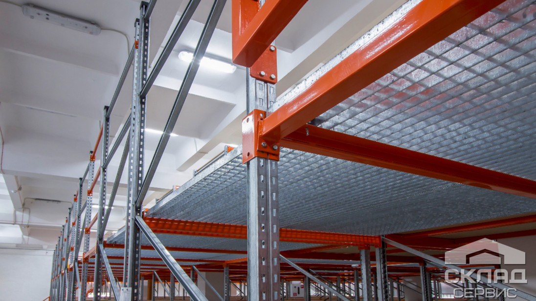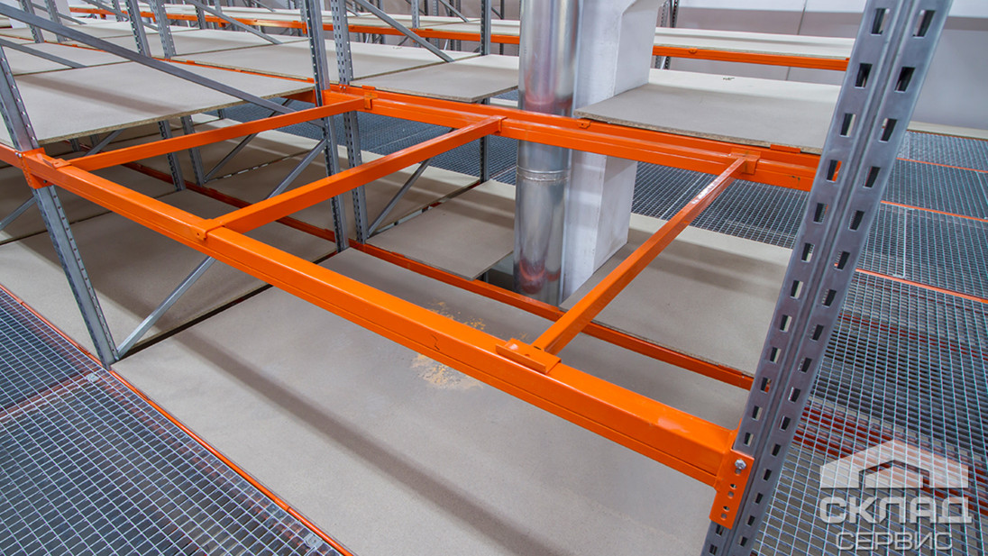 Великий план конструктиву стелажів: вертикальні стійки з оцинкованого профілю шириною 50 мм, діагональні зв'язку рами, помаранчеві траверси і гратчасті перекриття.