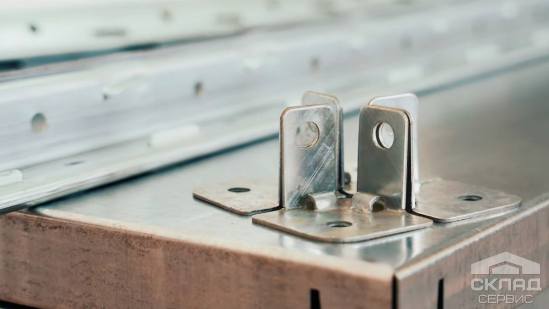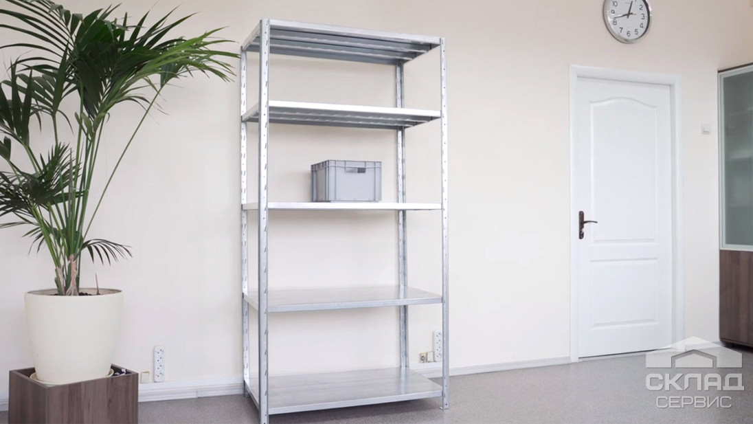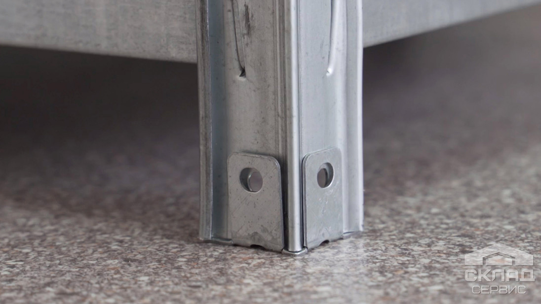Опис конструкції Стелаж металевий поличний складається всього з двох основних елементів: (1) Г-подібні стійки з кількома загинами, що одночасно забезпечують жорсткість і є елементами кріплення сусідніх секцій. (2) Суцільні металеві полиці, які дуже легко монтуються за рахунок самозаклинюв