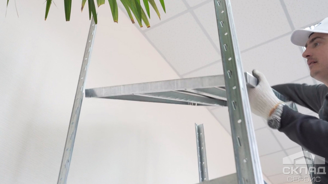Відразу звертаємо вашу увагу на те, що для складання стелажа Смарт не потрібні спеціальні інструменти та метизи - досить гумового молотка, але навіть якщо і його немає в наявності, можна застосувати пластикову рукоятку від звичайного молотка. Перший етап - це установка металевих підп'ятників під кожну зі стійок. Завдяки тому, що подпятники зроблені з металу, вони не зламаються і не лопнуть, на відміну від пластикових. Коли підп'ятники встановлені, на стійках маркером помічаємо місця кріплення полиць залежно від габаритів вантажу. Або, можна просто скористатися умовною лінійкою на стійці - крок перфорації дорівнює 10 см. Важливий момент! Для максимальної стійкості стелажа, нижня полиця не повинна кріпитися вище 30 см від підлоги. Стійку ставимо вертикально і на зачіп навішуємо кут полки. І так з чотирма стійками. За допомогою гумового молотка або іншим інструментам фіксуємо полку на зацепах. На каркас навішуємо інші полки і також їх фіксуємо. Для максимальної безпеки, стелаж можна прикріпити до стіни через монтажні отвори в стійці. Але конструкції з достатньою глибиною полки і без кріплення стійкі. Максимальне навантаження на полицю до 140 кг, тобто, на одній секції може розміститися до 700 кг ваги. Збірка стелажа зайняла близько 15 хв і стелаж готовий до експлуатації. Зберігайте свій вантаж правильно! Дивіться відео, щоб не пропустити деталі і правильно зібрати стелаж!