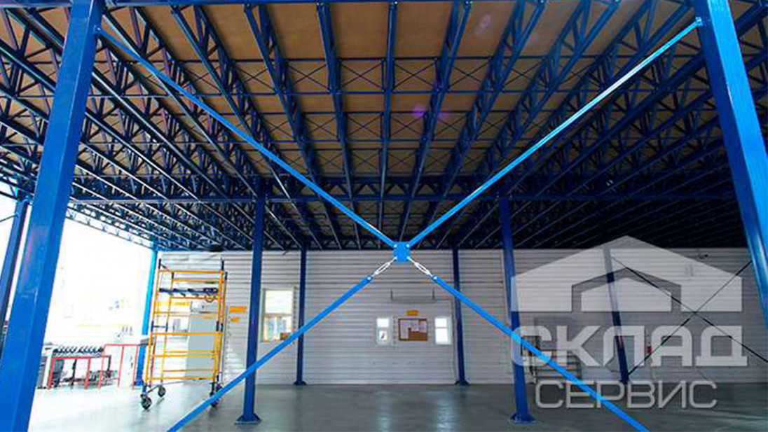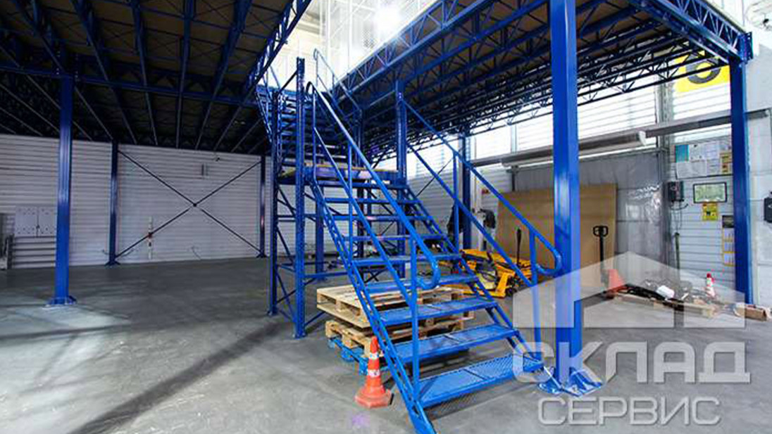 Опис конструкції Платформа на колонах служить ідеальним рішенням у випадках, коли нижні 3-4 метри складу вже зайняті обладнанням або їх потрібно залишити вільними для інших операцій, при цьому є незадіяна висота приміщення. Оскільки опори платформи стоять на відстані від 4 до 6 метрів одна від одно