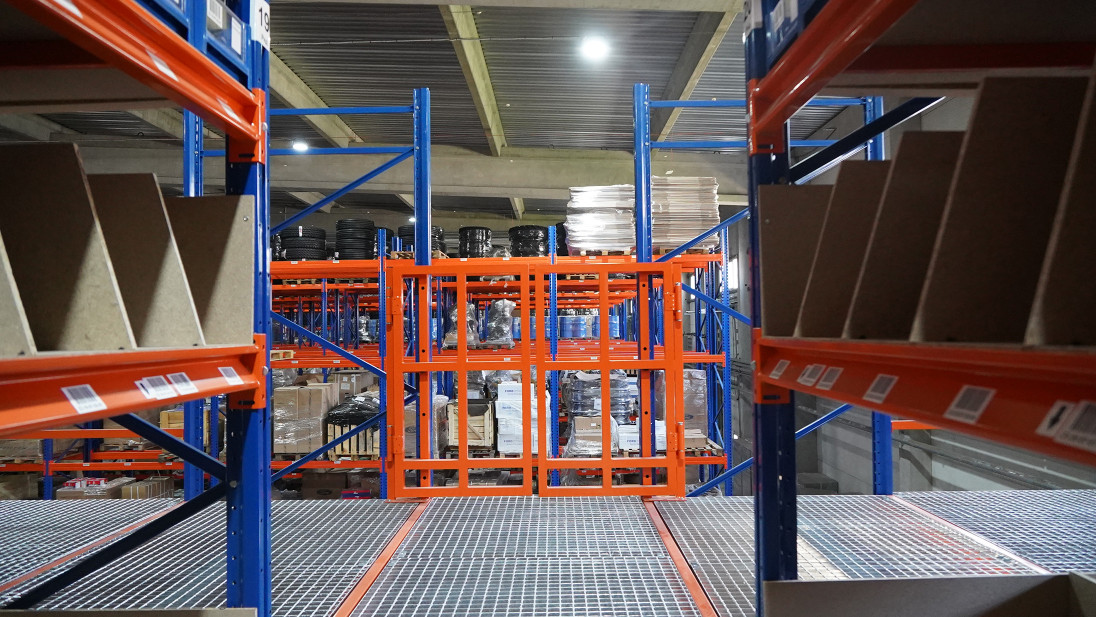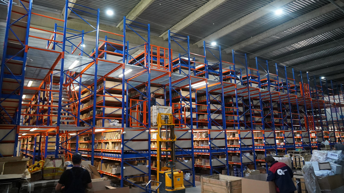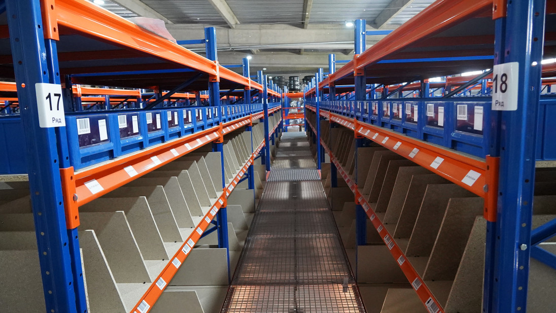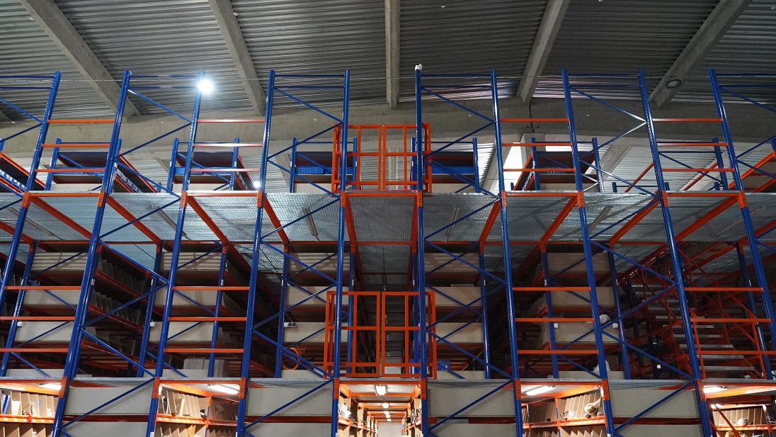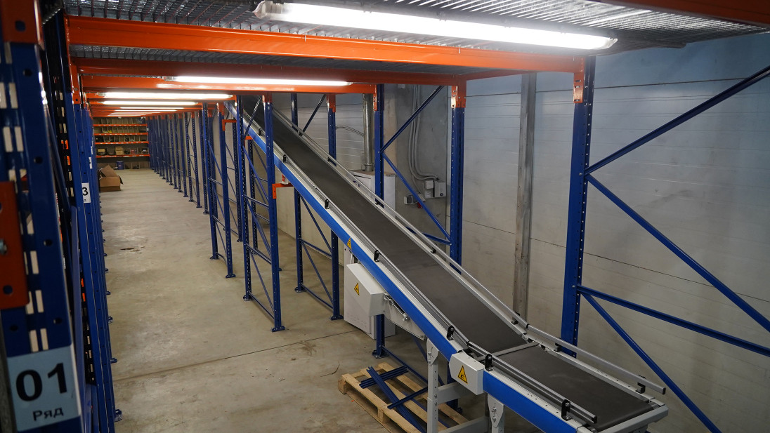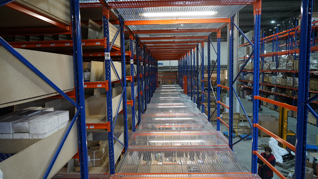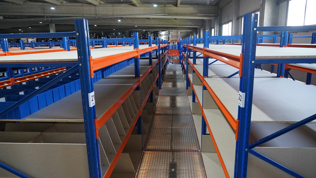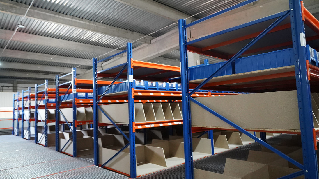 Такий триповерховий мезонін дозволяє зручно розсортувати продукцію на 12 000 поличках з ДСП, доповнених роздільниками по глибині та довжині.