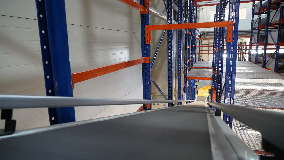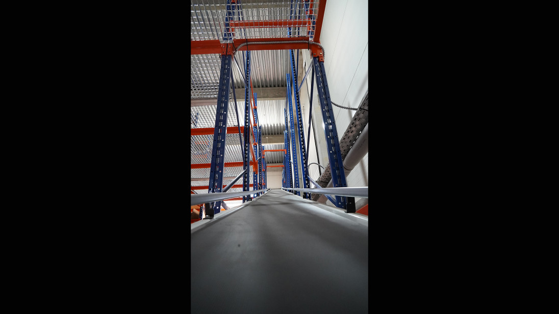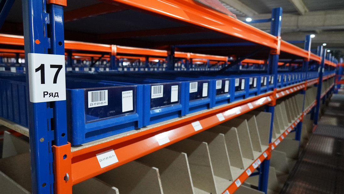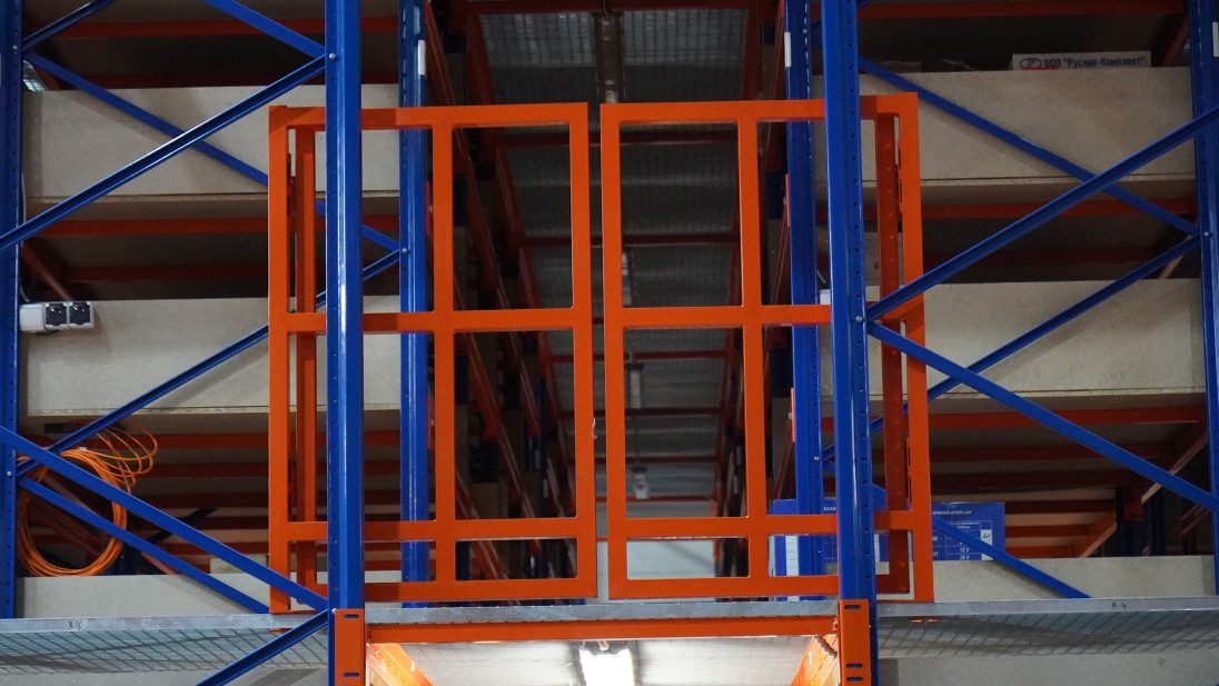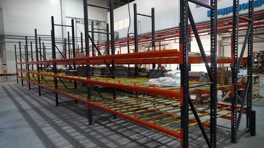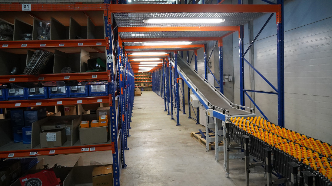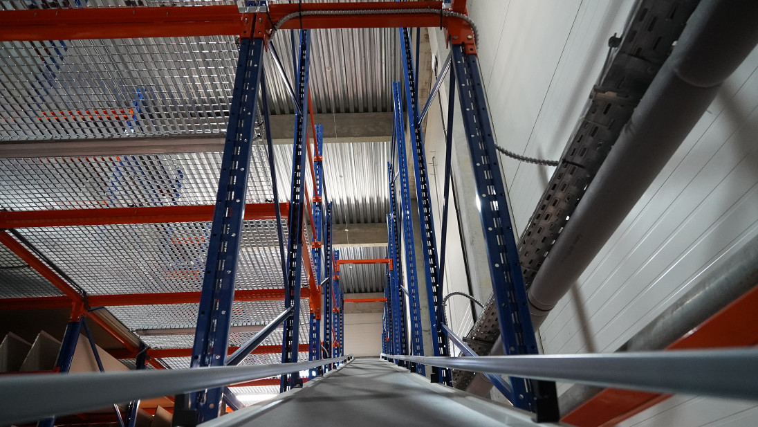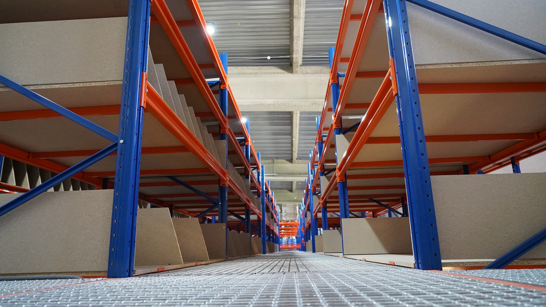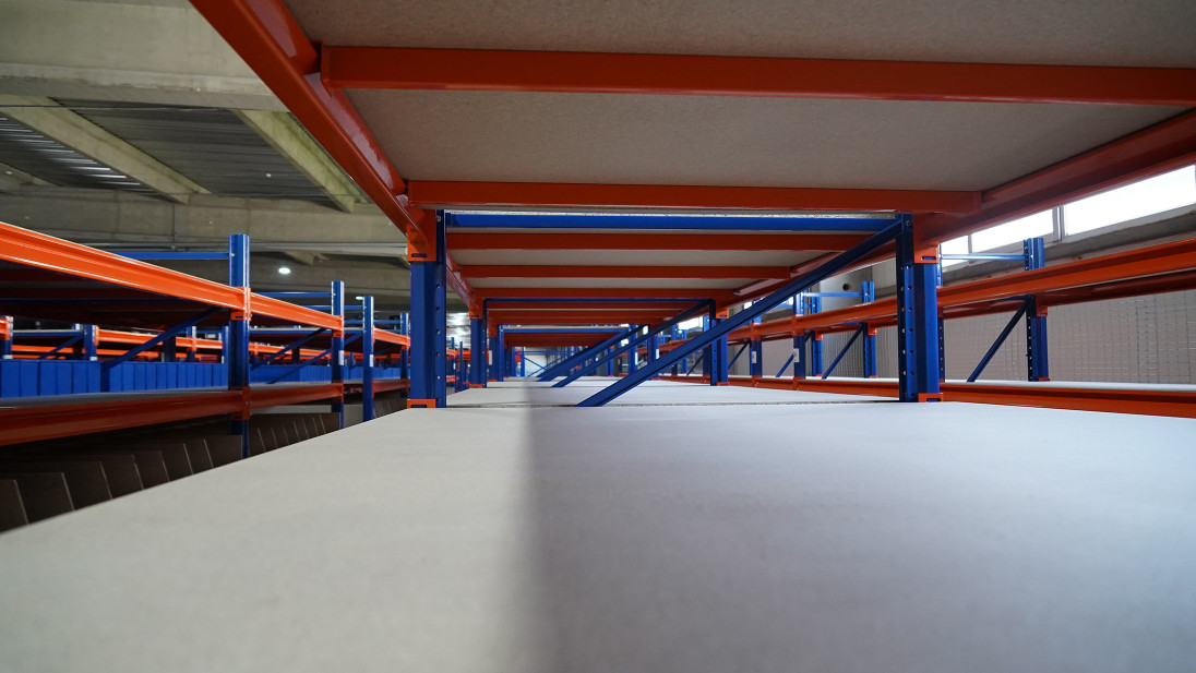 Такий триповерховий мезонін дозволяє зручно розсортувати продукцію на 12 000 поличках з ДСП, доповнених роздільниками по глибині та довжині.