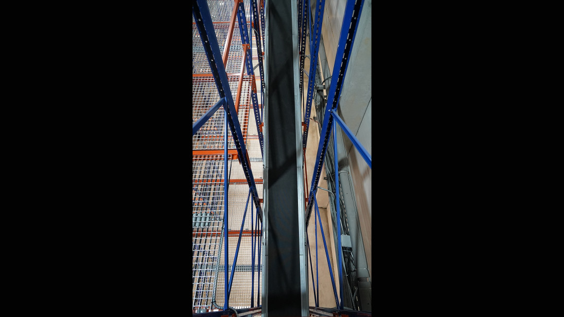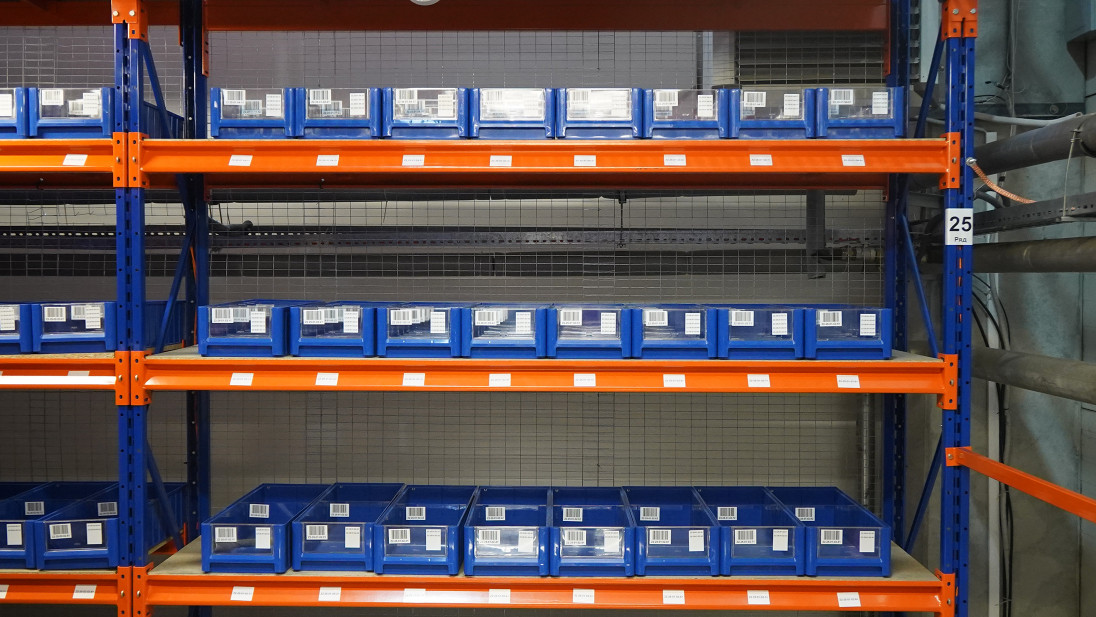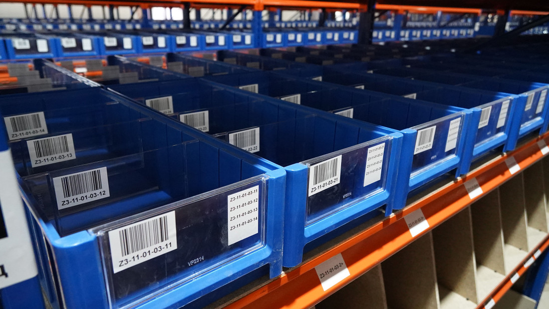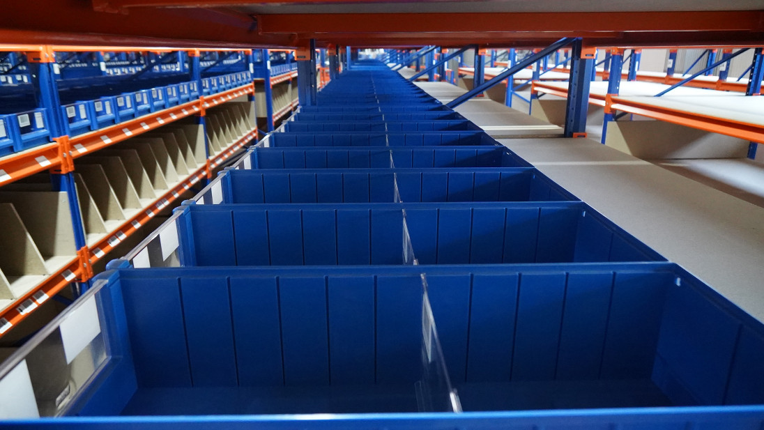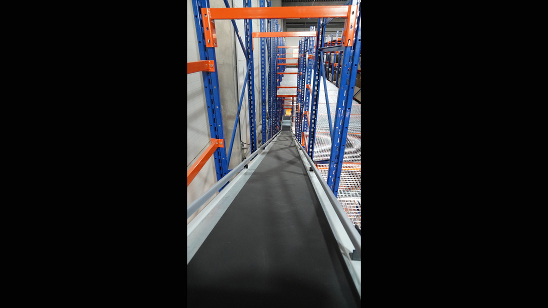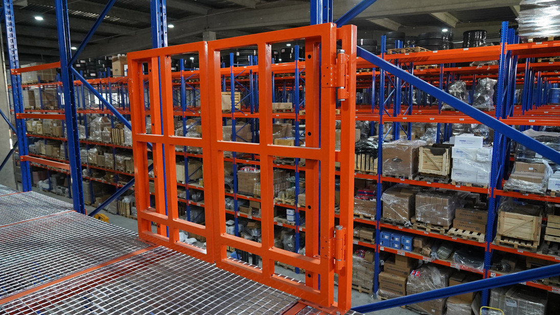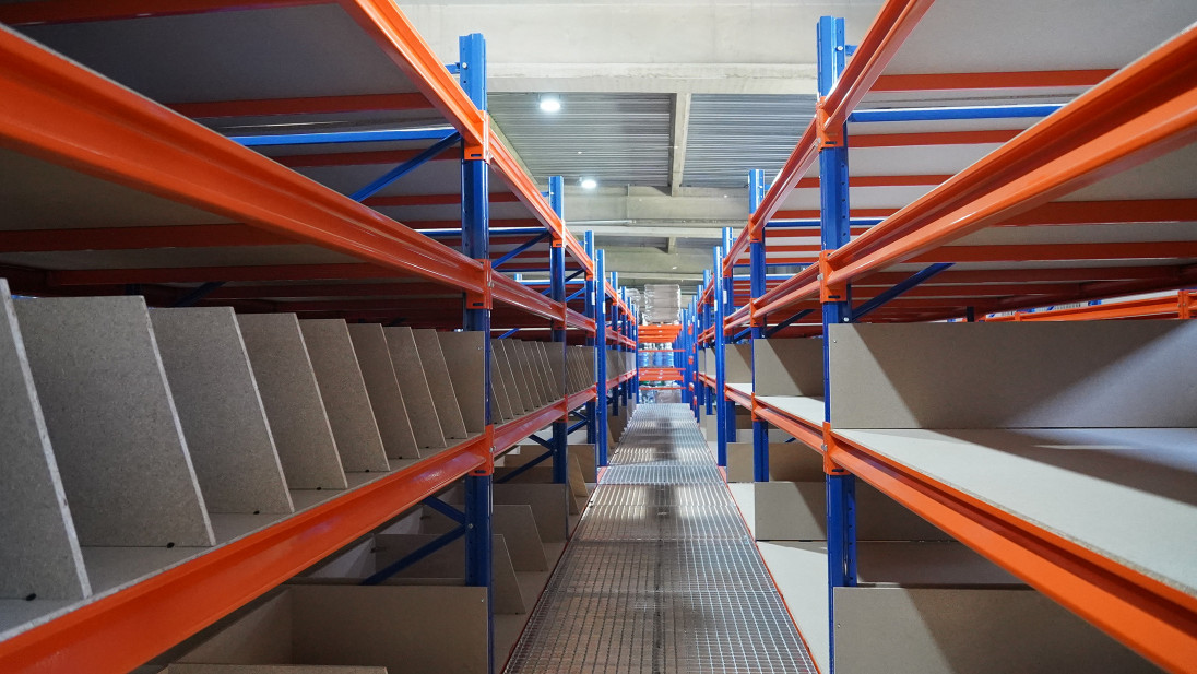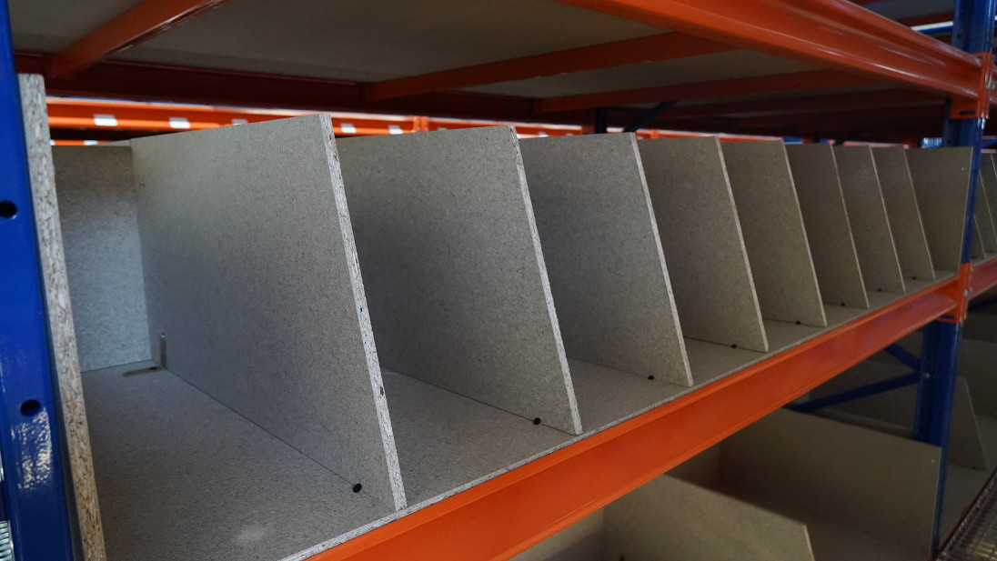 Такий триповерховий мезонін дозволяє зручно розсортувати продукцію на 12 000 поличках з ДСП, доповнених роздільниками по глибині та довжині.