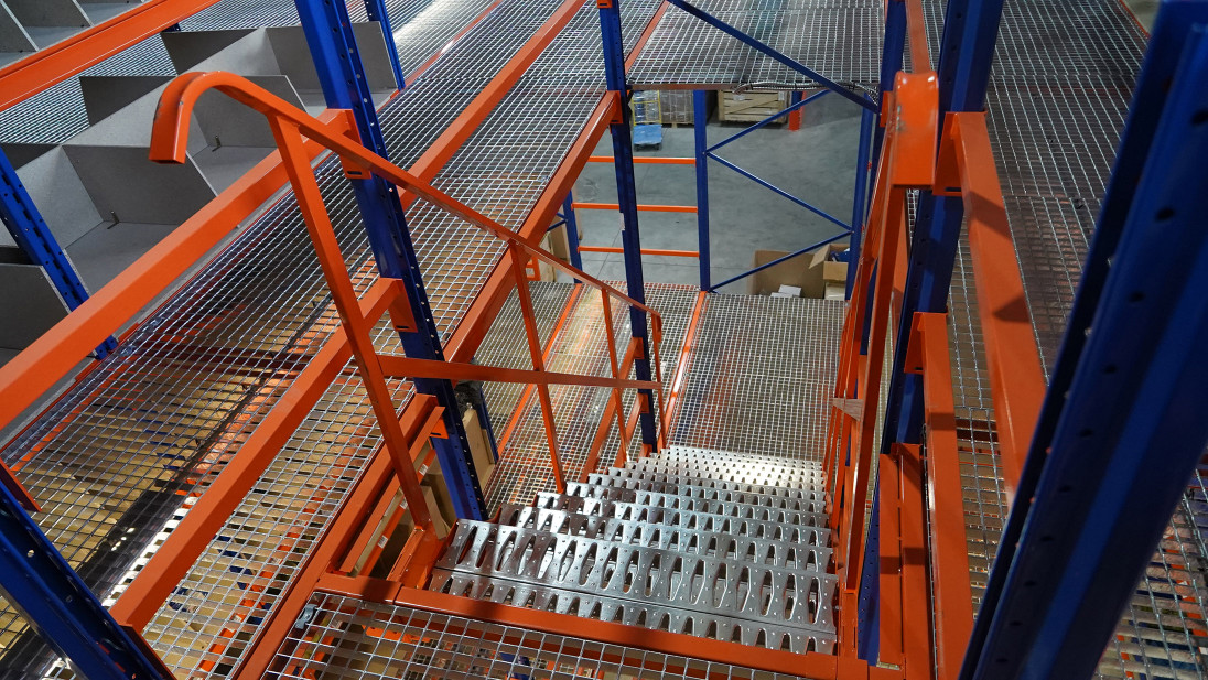 Опис конструкції Посилений мезонін базується на стандартних елементах палетних стелажів, які доукомплектовують елементами перекриття підлоги, полицями, драбинами, поручнями безпеки і вантажними воротами. Даний різновид багатоповерхової конструкції стелажів доцільно використовувати для дуже важких і