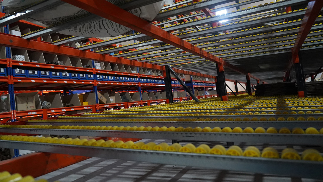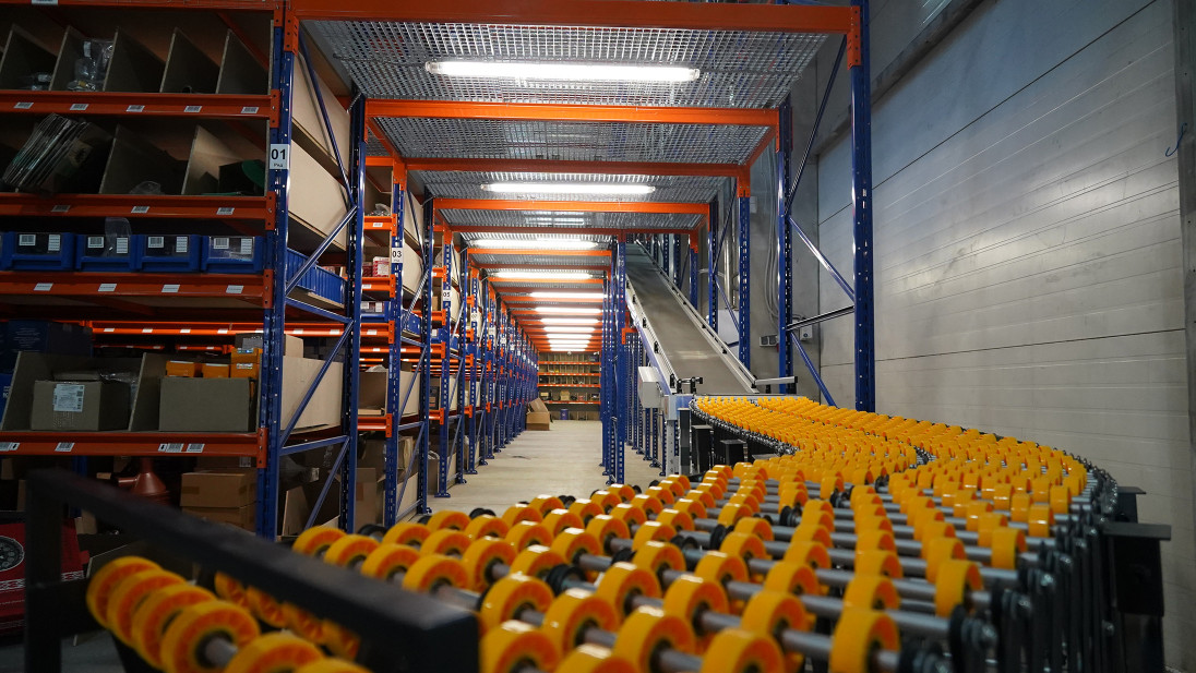 Але й це не всі родзинки проекту. Розташовані вздовж роликового конвеєра гравітаційні поличні стелажі допомагають комплектувальнику: відтепер не він прямує до коробки, натомість коробка надходить прямісінько до нього в руки. Адже гравітаційні стелажі передбачають переміщення товару під впливом власної ваги і не потребують підключення електричного приводу.