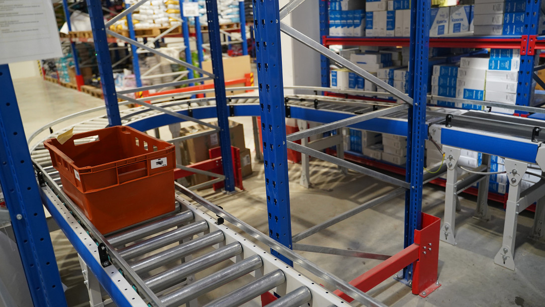 Для цього впровадили комбіновану смарт систему, яка спрацьовує тільки тоді, коли фіксує товар. Вона представлена чотирма зетобразними стрічковими міжрівневими конвеєрними лініями, привідними та гравітаційними модулями. Завдяки цьому товари з кожного поверху переміщуються в єдиний нижній сектор гравітаційного конвеєра. Тут, сортувальник розподіляє лотки з замовленнями, що надійшли з різних поверхів, в один адресний канал на поличковій гравітації. Після чого пакувальник консолідує вміст лотків з каналу в відвантажувальну тару, яка власне й відправляється на адресу замовника.