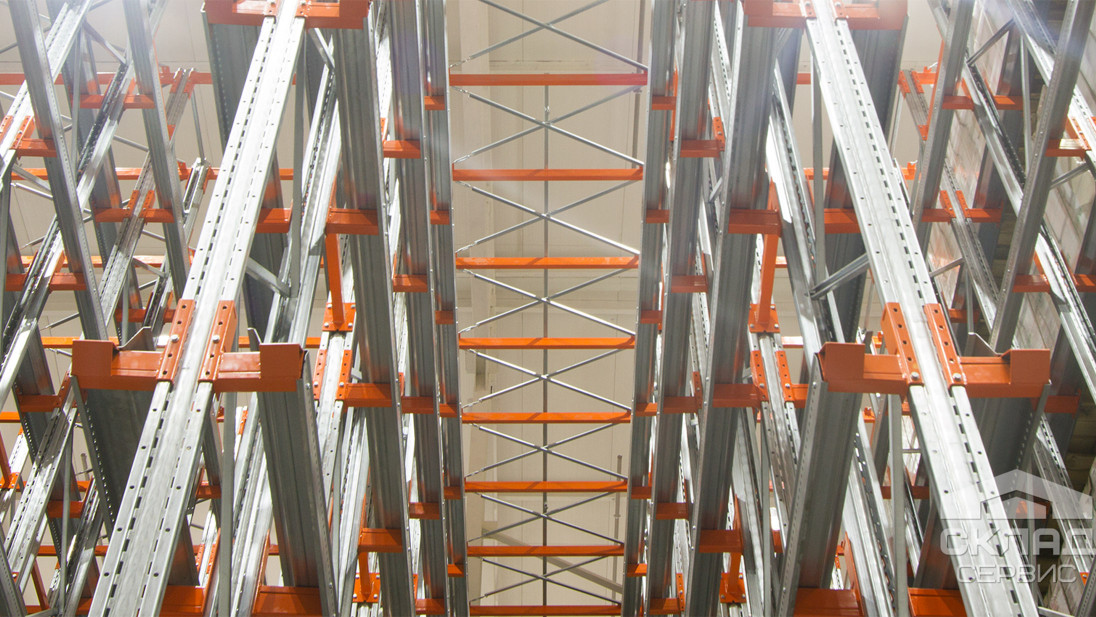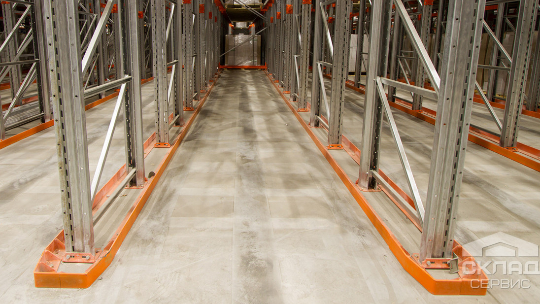 Конструкція встановлених стелажів практично повністю зайняла площу складу, що дозволило досягти максимального ступеня компактності для зберігання продукції. Як результат, 70-80% складського приміщення - корисна площа для зберігання вантажу. Такий результат може досягатися завдяки тому, що в'їзні стелажі не мають традиційних проходів між собою, і в цьому їх головна особливість. Щоб помістити або вивантажити палету, навантажувач заїжджає в канал між стійками, а не між рядами, як це відбувається при установці фронтальних стелажів. Як видно на відео, палети рівно встановлені в канали на направляючому профілі спеціальної форми - ложіменті, завдяки чому забезпечується швидке і безпечне захоплення піддону вилами навантажувача. Під час роботи техніки всередині каналу, захист стійок від пошкоджень забезпечують напрямні рейки-відбійники. Для жорсткості і надійності всієї конструкції, всередині системи використовуються вертикальні і горизонтальні стяжки (розкоси). Дивіться нашу відеопрезентацію в'їзних паллетних стелажів, і якщо у вас ще залишилися сумніви щодо представленої стелажної системи і ви не можете визначиться, чи підходить вона для реалізації саме ваших завдань - телефонуйте, і наші проект-менеджери дадуть відповідь на всі ваші запитання. Звернувшись до нас, ви отримаєте повний комплекс послуг на стадії виконання проекту!